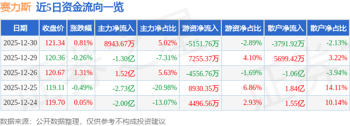 证券之星消息,截至2025年12月30日收盘,赛力斯(601127)报收于121.34元,上涨0.81%,换手率0.97%,成交量14.71万手,成交额17.82亿元。