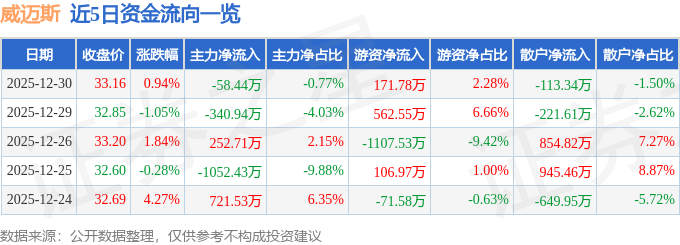 证券之星消息,截至2025年12月30日收盘,威迈斯(688612)报收于33.16元,上涨0.94%,换手率0.9%,成交量2.27万手,成交额7541.75万元。