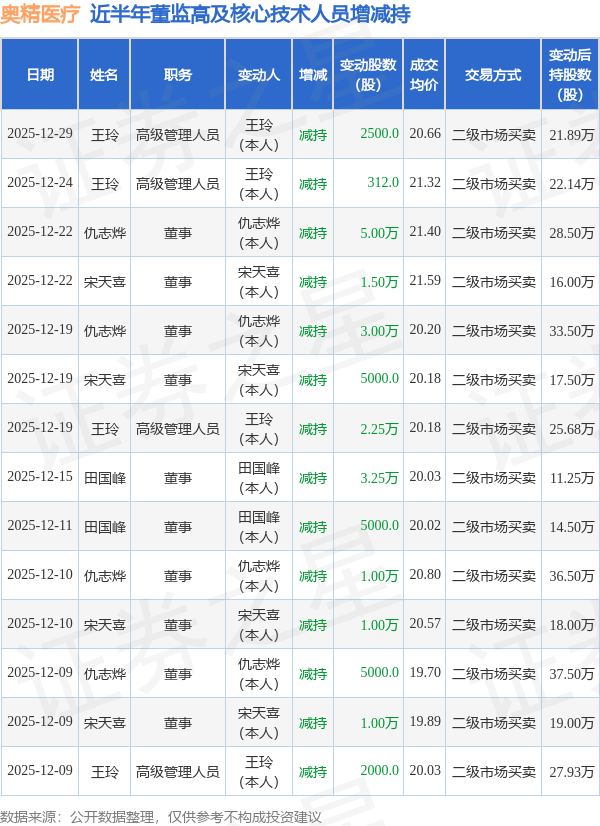 奥精医疗近半年内的董监高及核心技术人员增减持详情如下:
