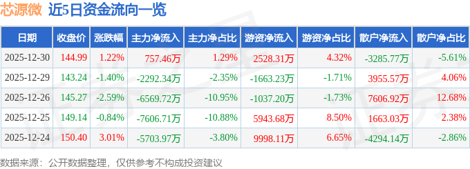 证券之星消息,截至2025年12月30日收盘,芯源微(688037)报收于144.99元,上涨1.22%,换手率2.0%,成交量4.02万手,成交额5.86亿元。