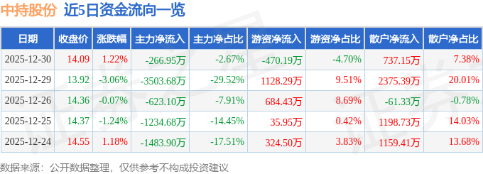 证券之星消息,截至2025年12月30日收盘,中持股份(603903)报收于14.09元,上涨1.22%,换手率2.76%,成交量7.06万手,成交额9994.11万元。
