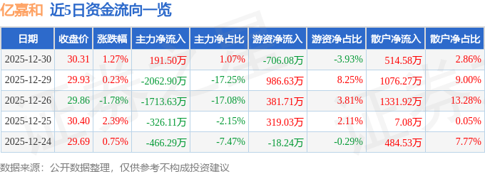 12月30日的资金流向数据方面,主力资金净流入191.5万元,占总成交额1.07%,游资资金净流出706.08万元,占总成交额3.93%,散户资金净流入514.58万元,占总成交额2.86%。