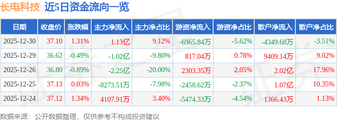 证券之星消息,截至2025年12月30日收盘,长电科技(600584)报收于37.1元,上涨1.31%,换手率1.87%,成交量33.48万手,成交额12.4亿元。