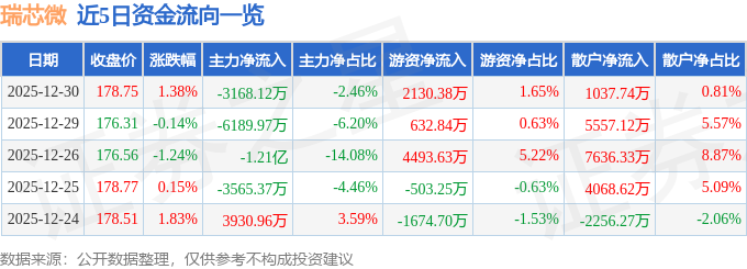 证券之星消息,截至2025年12月30日收盘,瑞芯微(603893)报收于178.75元,上涨1.38%,换手率1.73%,成交量7.26万手,成交额12.88亿元。