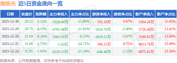 证券之星消息,截至2025年12月30日收盘,南极光(300940)报收于29.12元,下跌2.12%,换手率4.85%,成交量7.64万手,成交额2.24亿元。