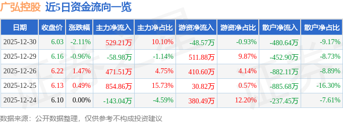 证券之星消息,截至2025年12月30日收盘,广弘控股(000529)报收于6.03元,下跌2.11%,换手率1.51%,成交量8.62万手,成交额5240.13万元。