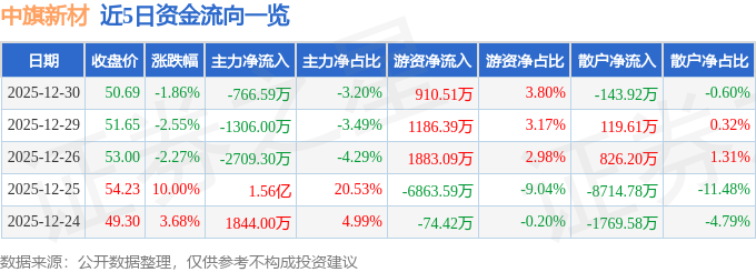 证券之星消息,截至2025年12月30日收盘,中旗新材(001212)报收于50.69元,下跌1.86%,换手率2.71%,成交量4.71万手,成交额2.4亿元。