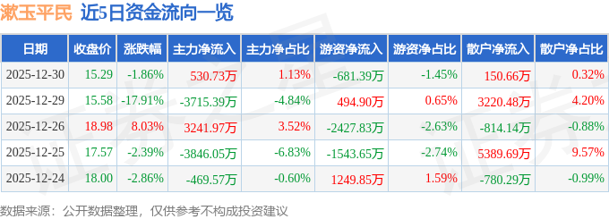 证券之星消息,截至2025年12月30日收盘,漱玉平民(301017)报收于15.29元,下跌1.86%,换手率12.47%,成交量30.35万手,成交额4.69亿元。