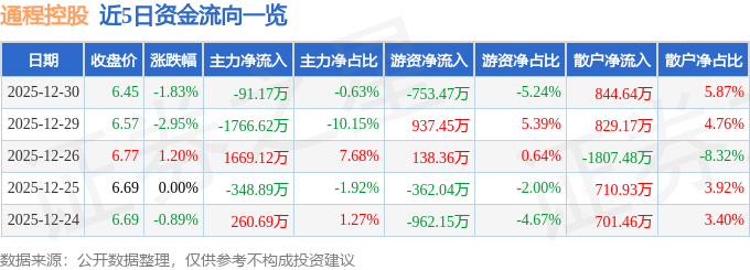 证券之星消息,截至2025年12月30日收盘,通程控股(000419)报收于6.45元,下跌1.83%,换手率4.1%,成交量22.27万手,成交额1.44亿元。