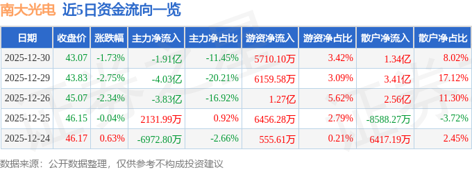 证券之星消息,截至2025年12月30日收盘,南大光电(300346)报收于43.07元,下跌1.73%,换手率5.87%,成交量38.55万手,成交额16.67亿元。