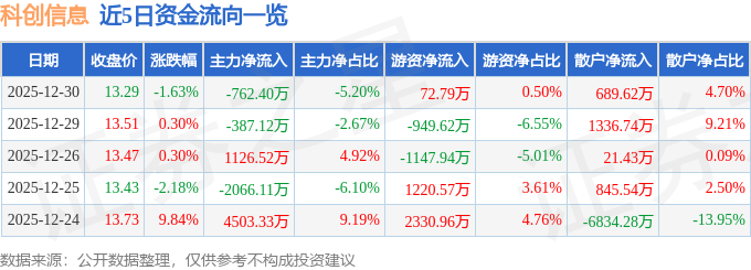 证券之星消息,截至2025年12月30日收盘,科创信息(300730)报收于13.29元,下跌1.63%,换手率5.64%,成交量10.91万手,成交额1.47亿元。