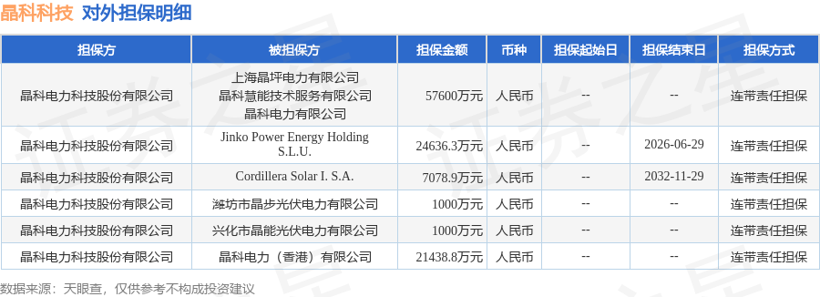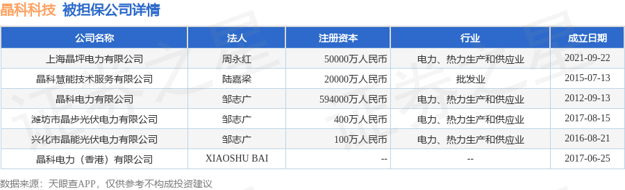 晶科科技12月29日披露6笔对外担保,被担保公司9家。对外担保明细如下表: