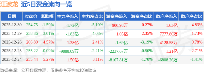 证券之星消息,截至2025年12月30日收盘,江波龙(301308)报收于254.75元,下跌1.59%,换手率4.77%,成交量13.08万手,成交额33.83亿元。