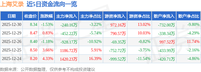 证券之星消息,截至2025年12月30日收盘,上海艾录(301062)报收于8.34元,下跌1.53%,换手率2.85%,成交量8.88万手,成交额7466.94万元。