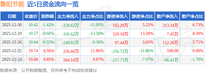 证券之星消息,截至2025年12月30日收盘,鲁阳节能(002088)报收于10.42元,下跌1.42%,换手率0.6%,成交量3.03万手,成交额3168.4万元。