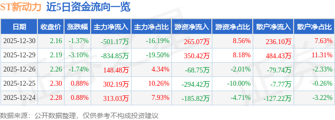 证券之星消息,截至2025年12月30日收盘,ST新动力(300152)报收于2.16元,下跌1.37%,换手率1.99%,成交量14.16万手,成交额3095.44万元。