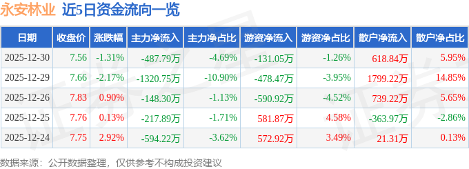 证券之星消息,截至2025年12月30日收盘,永安林业(000663)报收于7.56元,下跌1.31%,换手率4.48%,成交量13.73万手,成交额1.04亿元。