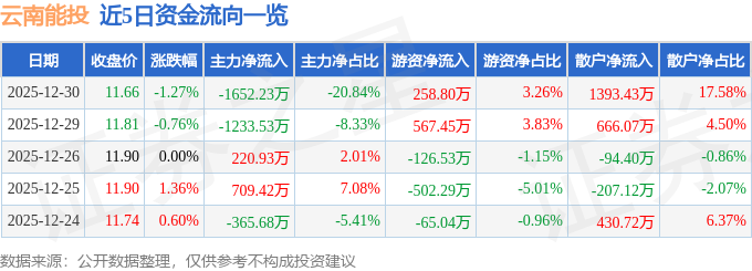 证券之星消息,截至2025年12月30日收盘,云南能投(002053)报收于11.66元,下跌1.27%,换手率0.74%,成交量6.77万手,成交额7927.58万元。