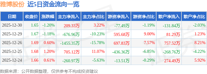 证券之星消息,截至2025年12月30日收盘,雅博股份(002323)报收于1.65元,下跌1.2%,换手率1.85%,成交量39.17万手,成交额6502.24万元。