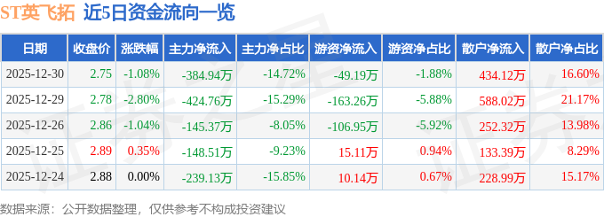证券之星消息,截至2025年12月30日收盘,ST英飞拓(002528)报收于2.75元,下跌1.08%,换手率0.91%,成交量9.57万手,成交额2614.68万元。