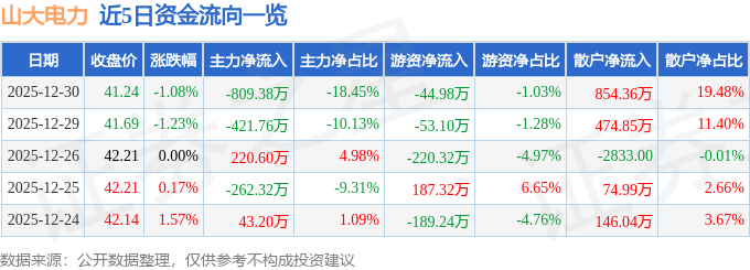 证券之星消息,截至2025年12月30日收盘,山大电力(301609)报收于41.24元,下跌1.08%,换手率3.05%,成交量1.06万手,成交额4386.76万元。