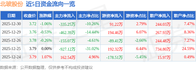 证券之星消息,截至2025年12月30日收盘,北玻股份(002613)报收于3.72元,下跌1.06%,换手率1.13%,成交量8.76万手,成交额3267.14万元。