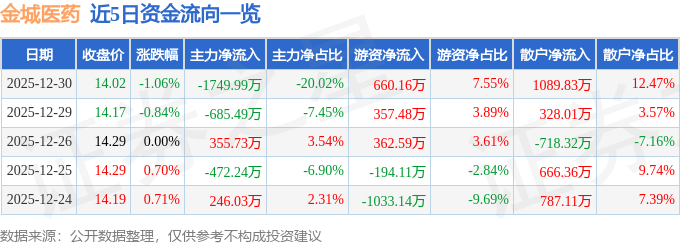 证券之星消息,截至2025年12月30日收盘,金城医药(300233)报收于14.02元,下跌1.06%,换手率1.68%,成交量6.23万手,成交额8740.32万元。