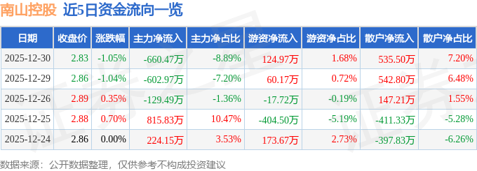 证券之星消息,截至2025年12月30日收盘,南山控股(002314)报收于2.83元,下跌1.05%,换手率1.96%,成交量26.27万手,成交额7433.46万元。