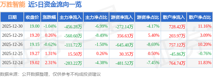 证券之星消息,截至2025年12月30日收盘,万胜智能(300882)报收于19.0元,下跌1.04%,换手率1.29%,成交量3.43万手,成交额6524.29万元。