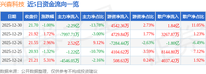 证券之星消息,截至2025年12月30日收盘,兴森科技(002436)报收于21.7元,下跌1.0%,换手率5.04%,成交量76.1万手,成交额16.63亿元。