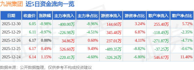 证券之星消息,截至2025年12月30日收盘,九洲集团(300040)报收于6.05元,下跌0.98%,换手率1.42%,成交量7.35万手,成交额4466.64万元。