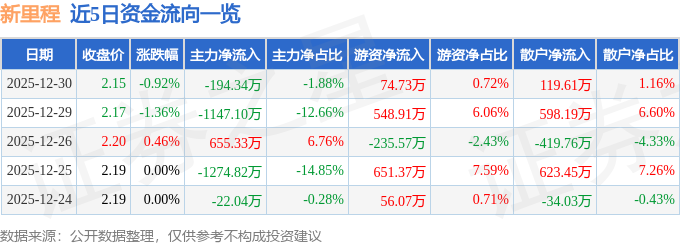 证券之星消息,截至2025年12月30日收盘,新里程(002219)报收于2.15元,下跌0.92%,换手率1.47%,成交量47.97万手,成交额1.03亿元。