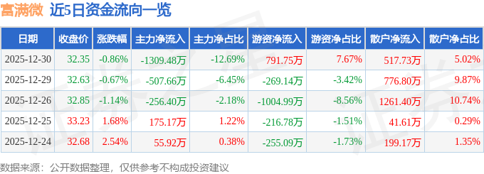 证券之星消息,截至2025年12月30日收盘,富满微(300671)报收于32.35元,下跌0.86%,换手率1.43%,成交量3.17万手,成交额1.03亿元。