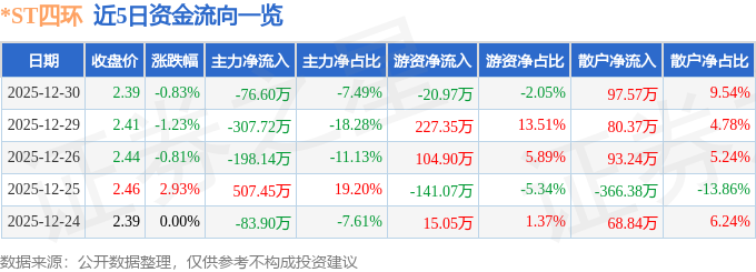证券之星消息,截至2025年12月30日收盘,*ST四环(000518)报收于2.39元,下跌0.83%,换手率0.42%,成交量4.28万手,成交额1022.32万元。