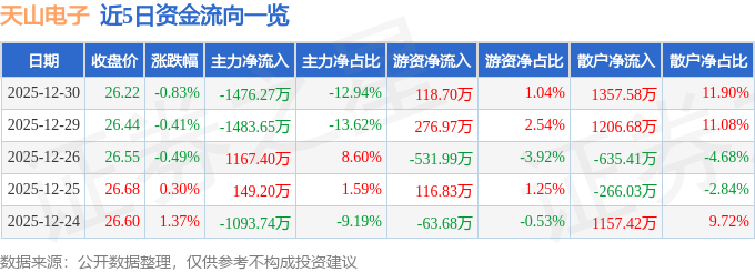 证券之星消息,截至2025年12月30日收盘,天山电子(301379)报收于26.22元,下跌0.83%,换手率3.4%,成交量4.33万手,成交额1.14亿元。