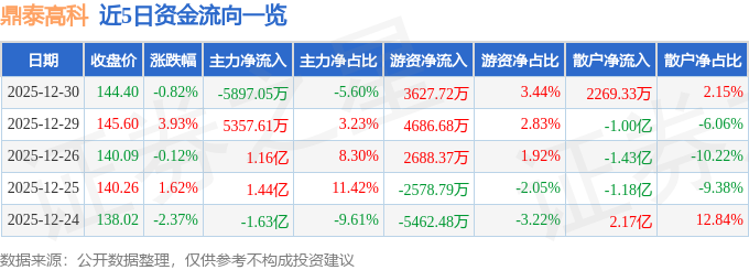 证券之星消息,截至2025年12月30日收盘,鼎泰高科(301377)报收于144.4元,下跌0.82%,换手率10.27%,成交量7.29万手,成交额10.54亿元。