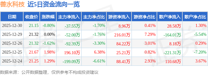 证券之星消息,截至2025年12月30日收盘,善水科技(301190)报收于21.15元,下跌0.8%,换手率0.65%,成交量1.04万手,成交额2204.39万元。
