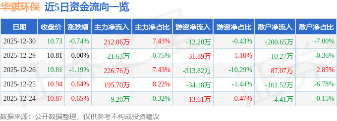 证券之星消息,截至2025年12月30日收盘,华骐环保(300929)报收于10.73元,下跌0.74%,换手率2.11%,成交量2.67万手,成交额2866.49万元。