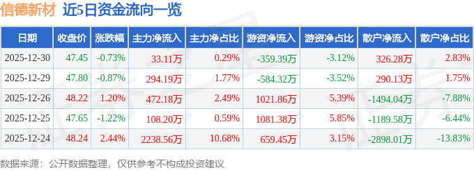证券之星消息,截至2025年12月30日收盘,信德新材(301349)报收于47.45元,下跌0.73%,换手率4.98%,成交量2.44万手,成交额1.15亿元。
