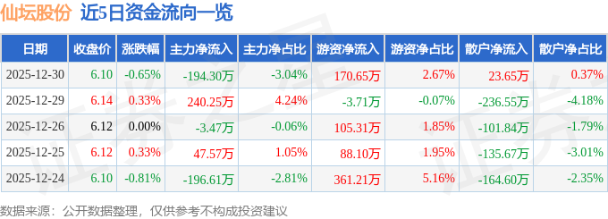 证券之星消息,截至2025年12月30日收盘,仙坛股份(002746)报收于6.1元,下跌0.65%,换手率1.47%,成交量10.44万手,成交额6396.24万元。