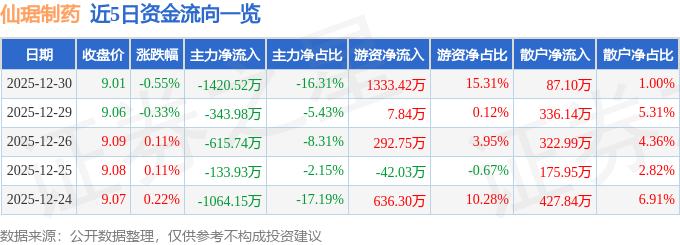 证券之星消息,截至2025年12月30日收盘,仙琚制药(002332)报收于9.01元,下跌0.55%,换手率0.98%,成交量9.66万手,成交额8711.31万元。