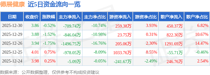 证券之星消息,截至2025年12月30日收盘,德展健康(000813)报收于3.86元,下跌0.52%,换手率0.82%,成交量17.11万手,成交额6606.29万元。
