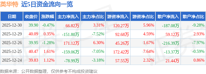 证券之星消息,截至2025年12月30日收盘,英华特(301272)报收于39.9元,下跌0.47%,换手率1.61%,成交量5047.0手,成交额2016.69万元。