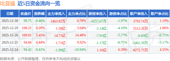 证券之星消息,截至2025年12月30日收盘,比亚迪(002594)报收于99.75元,下跌0.46%,换手率0.91%,成交量31.88万手,成交额31.75亿元。