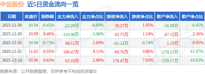证券之星消息,截至2025年12月30日收盘,中设股份(002883)报收于10.94元,下跌0.45%,换手率2.21%,成交量3.39万手,成交额3733.59万元。