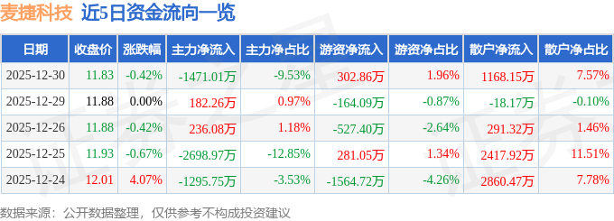 证券之星消息,截至2025年12月30日收盘,麦捷科技(300319)报收于11.83元,下跌0.42%,换手率1.57%,成交量13.0万手,成交额1.54亿元。