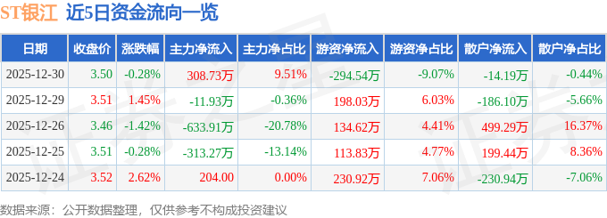 证券之星消息,截至2025年12月30日收盘,ST银江(300020)报收于3.5元,下跌0.28%,换手率1.2%,成交量9.23万手,成交额3247.32万元。