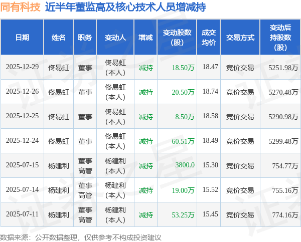 同有科技近半年内的董监高及核心技术人员增减持详情如下: