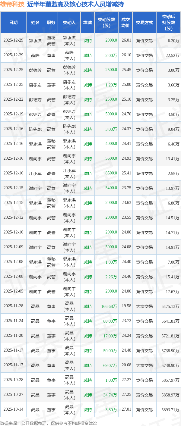 雄帝科技近半年内的董监高及核心技术人员增减持详情如下: