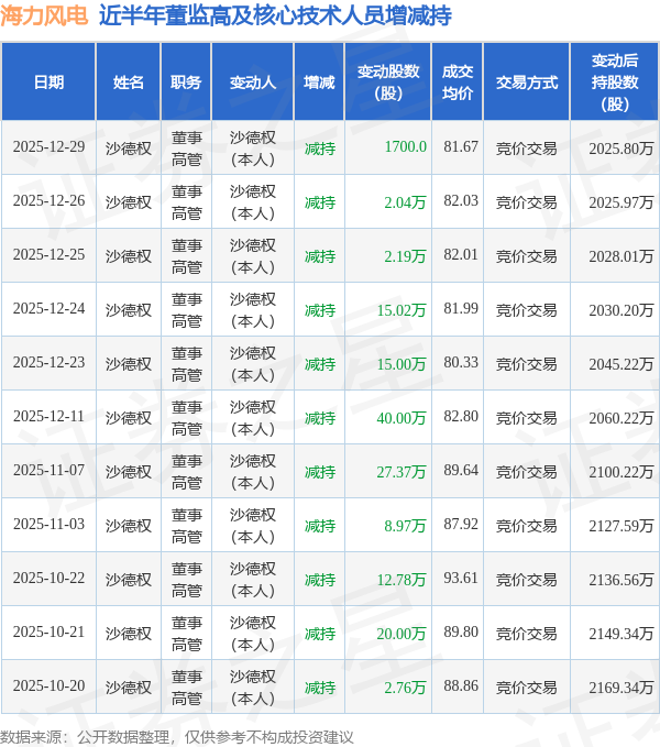 海力风电近半年内的董监高及核心技术人员增减持详情如下: